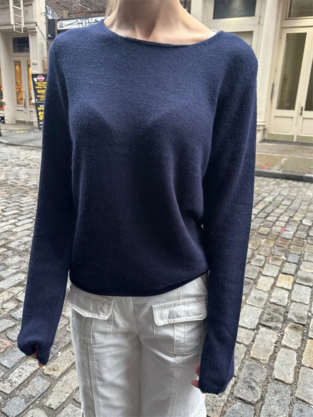 Raw Hem Navy Long Sleeve T-shirt Autumn Sweet Round Neck Cotton Tee Shirt For Woman Casual Vintage Streetwear Cute Tshirt Top