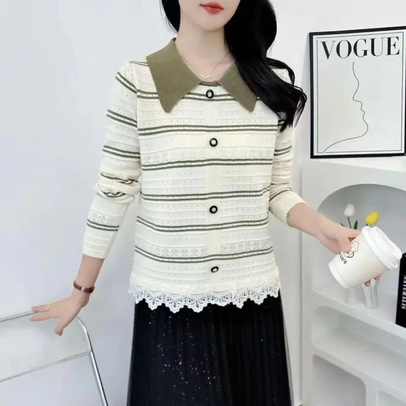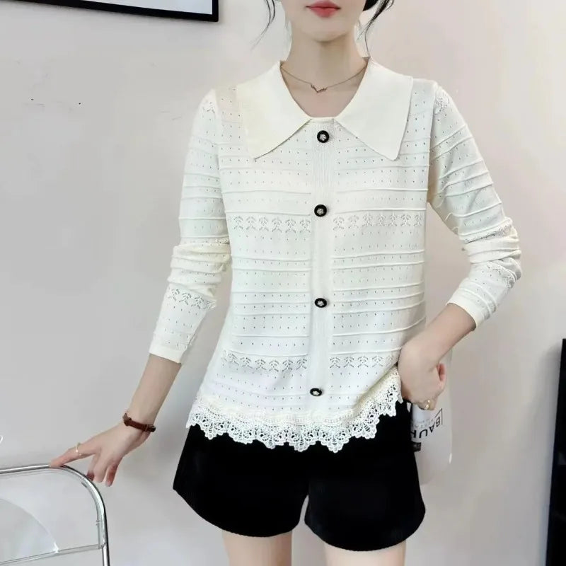 Women Clothes Spring Autumn Fashion Korean Button Solid Color Female All-match Hollow Out Temperament Appear Thin Long Sleeve To