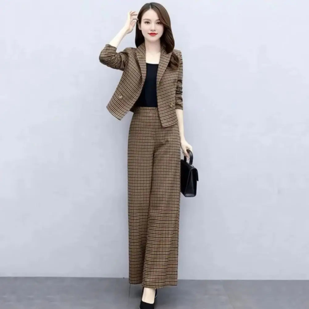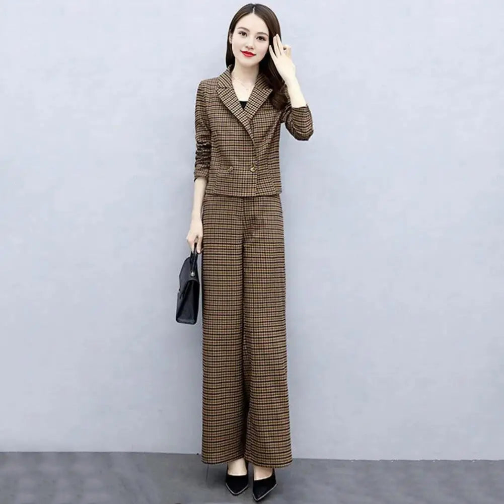 2025 Women Business Set Spring Blazer Coat Pants Set Plaid Print Cardigan Jacket Wide Leg High Waist Straight Trousers Set