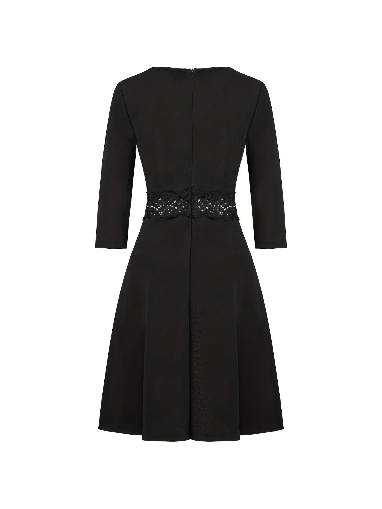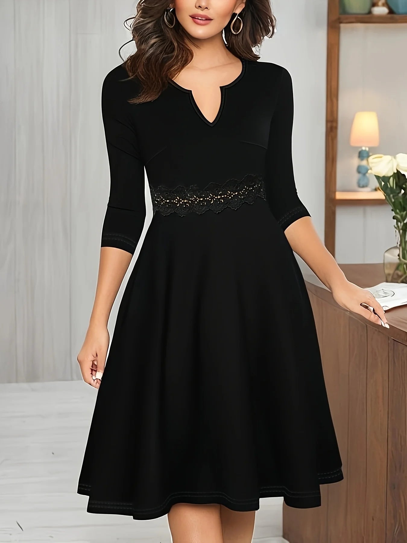 Women's Black Notched Neck 3/4 Sleeve Lace Panel Flared Midi Dress - Elegant Bodycon Cocktail Party Dress for Evening & Daily We