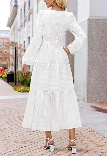 Cross border autumn and winter new V-neck waist cinched layered bubble sleeve dress, fashionable lotus leaf edge skirt