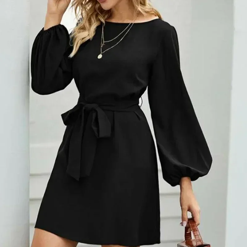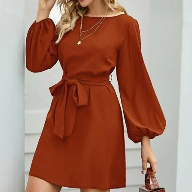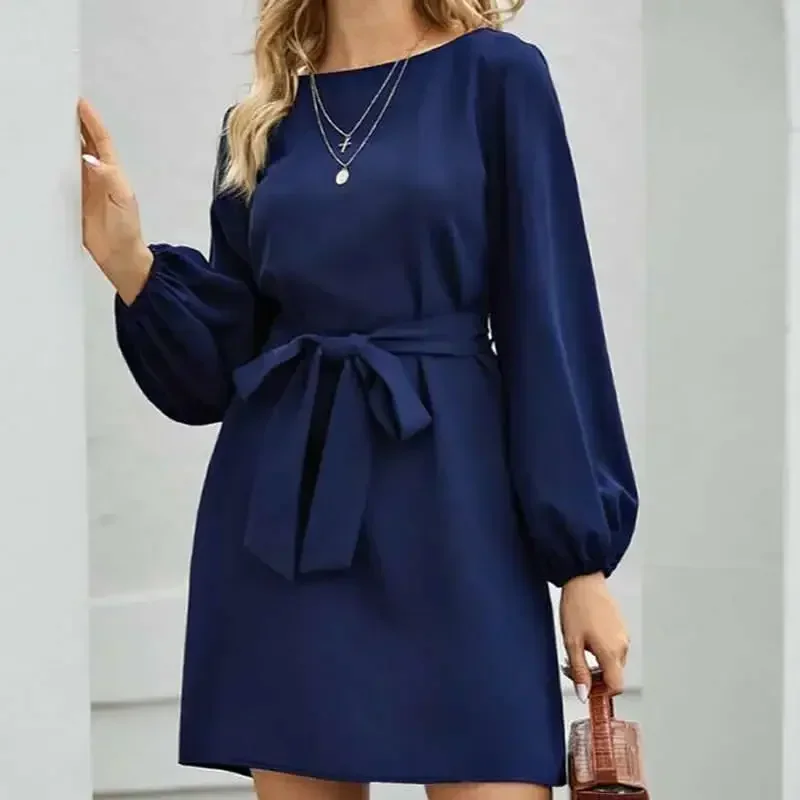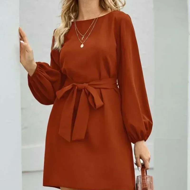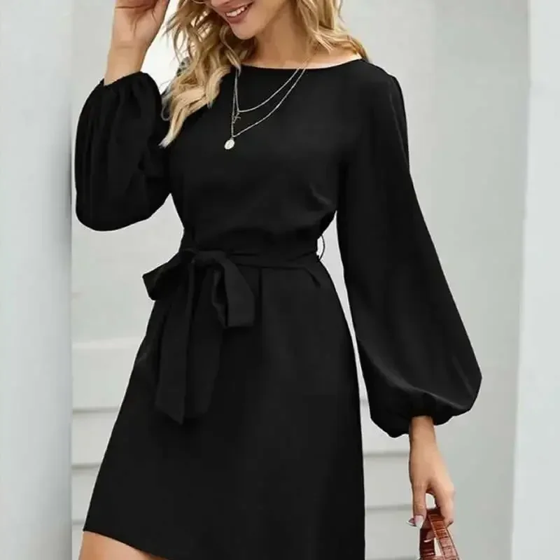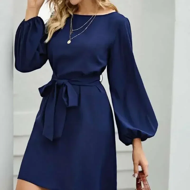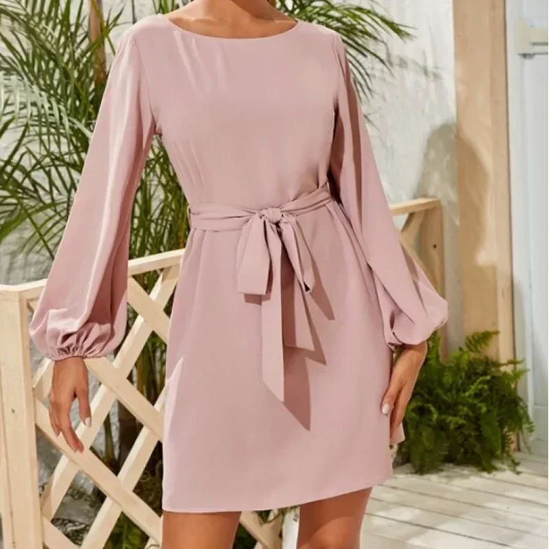 2025 Fashion Explosions Chiffon Solid Color Plus Size Loose Simple Lantern Sleeve Dress Belt Slim Temperament Women's Clothing
