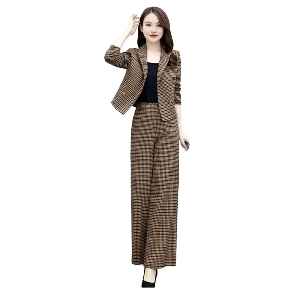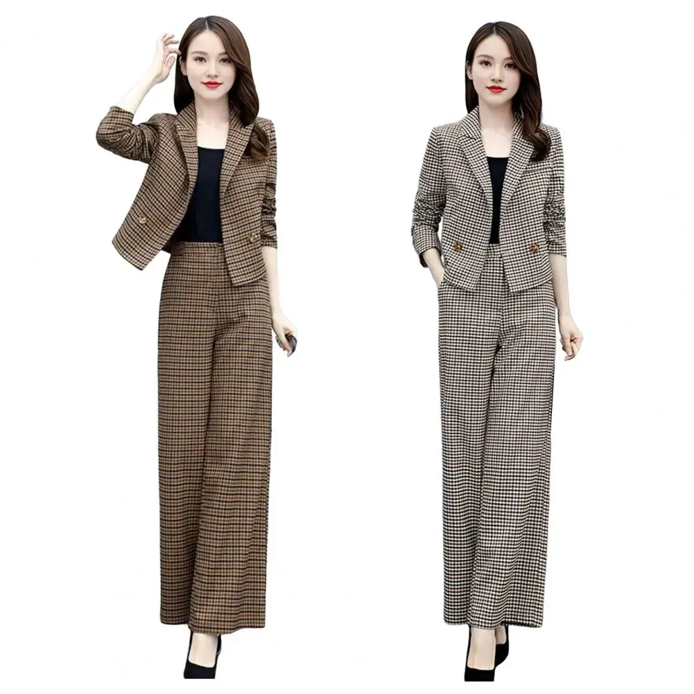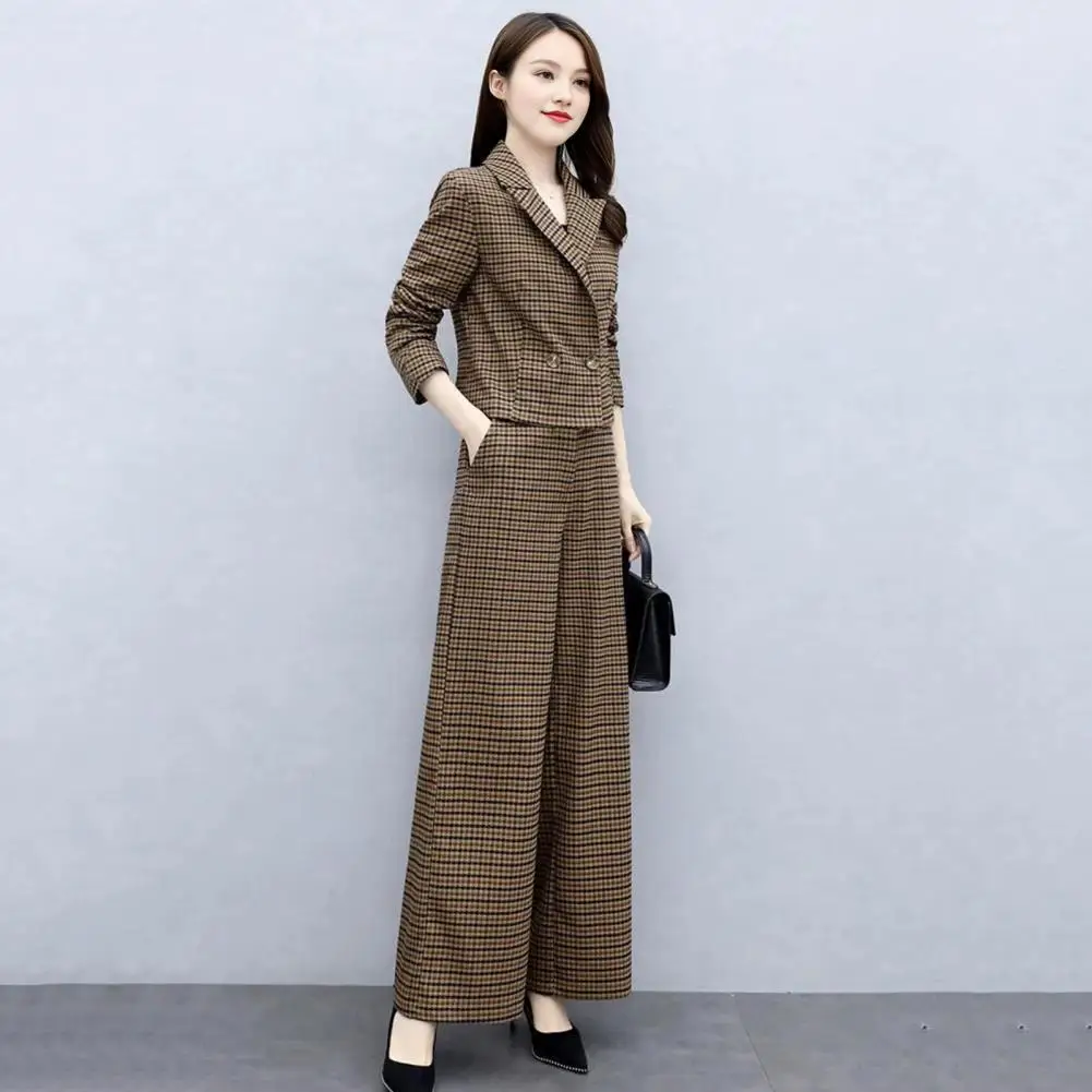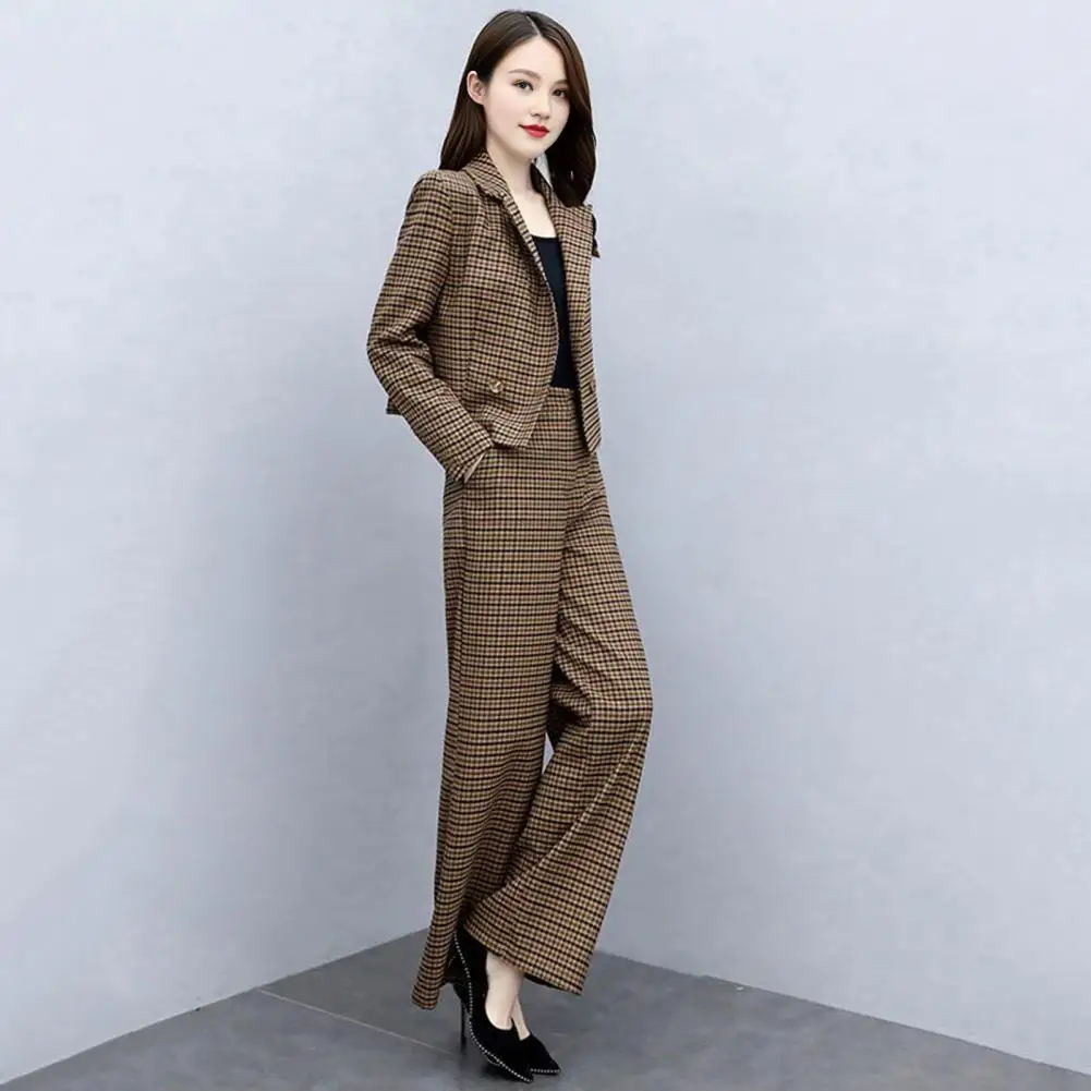 2 Pcs/Set Women Coat Pants Set Lapel Buttons Cardigan Plaid Print Long Sleeve Jacket Wide Leg High Waist Straight Trousers Lady Formal Commute Outfit