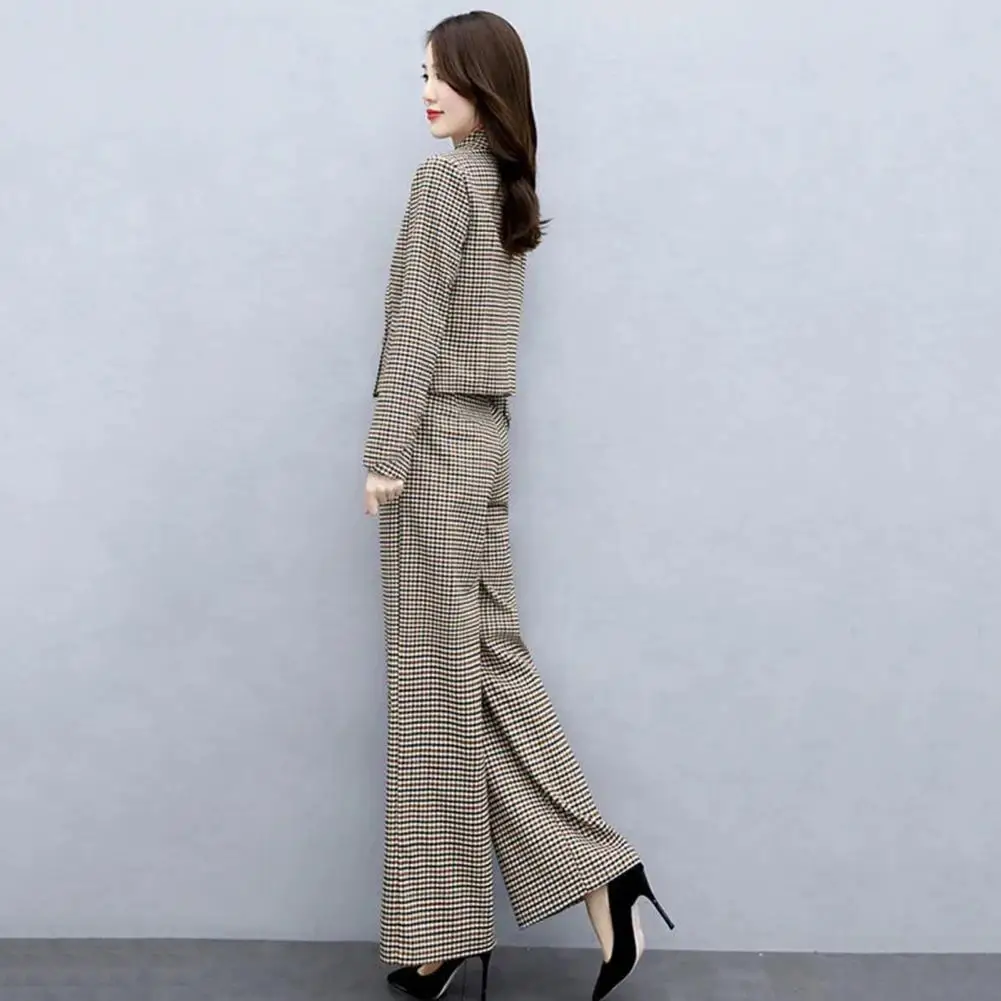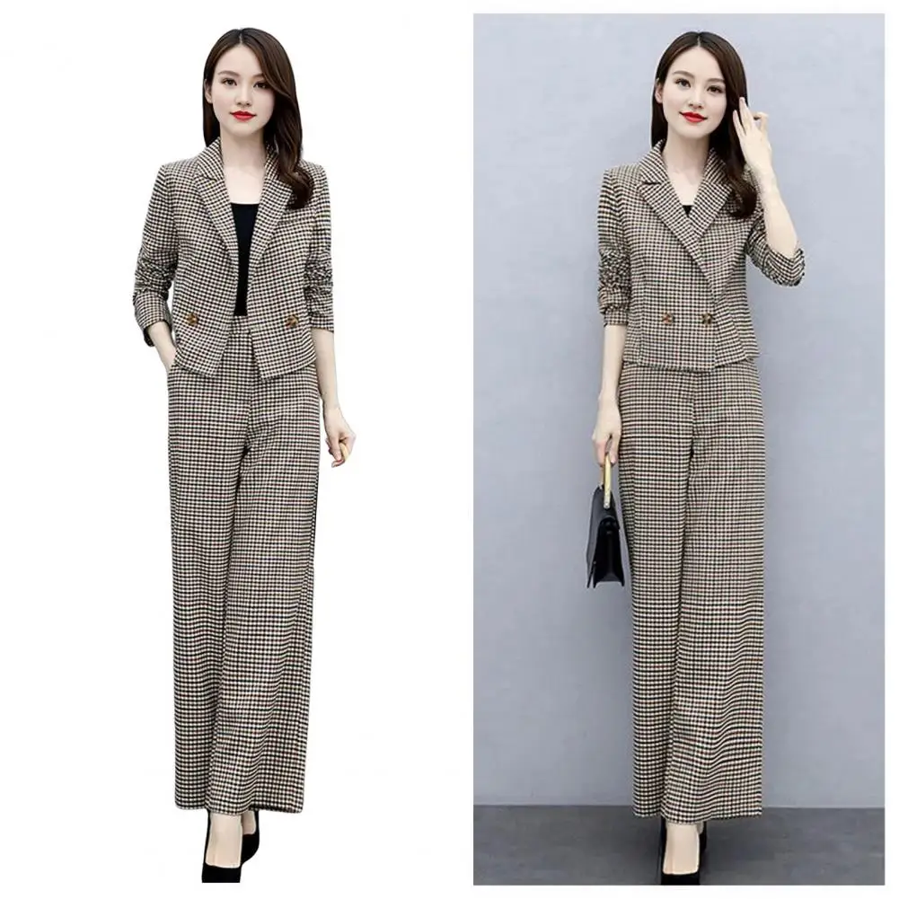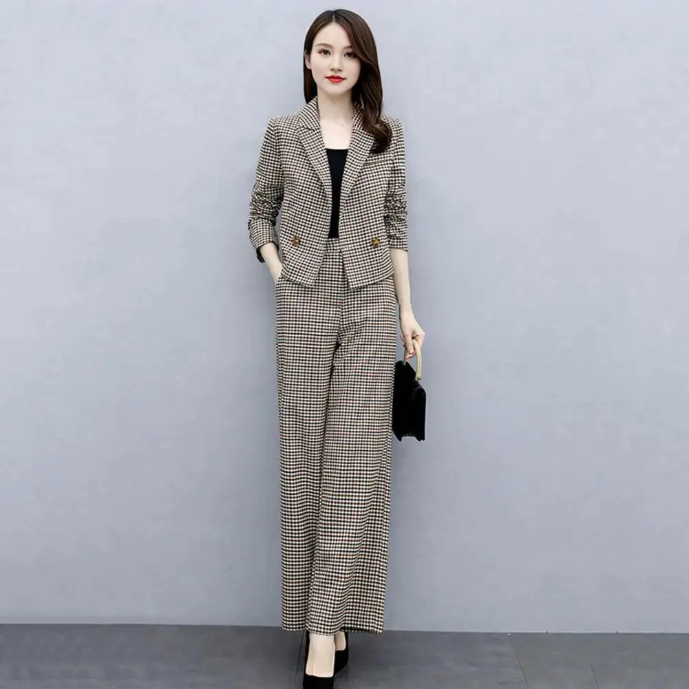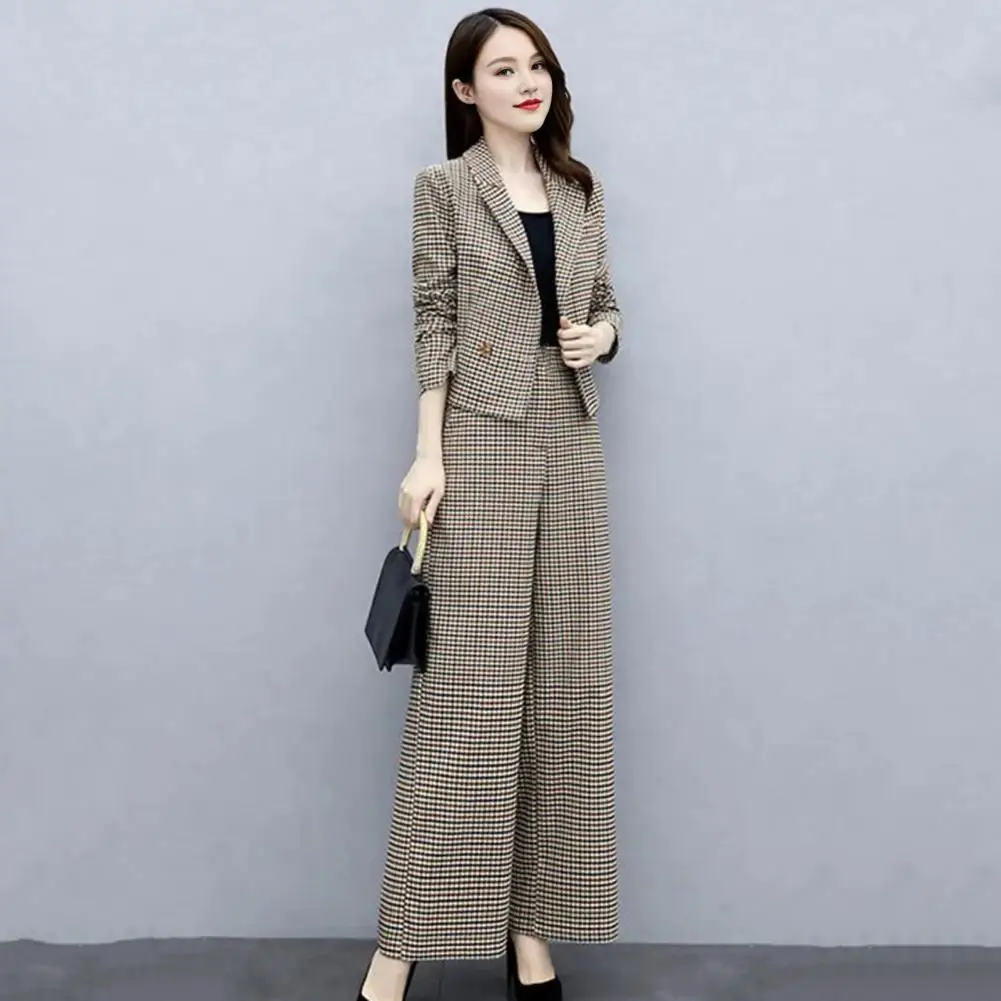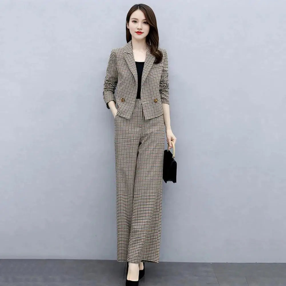 2 Pcs/Set Women Coat Pants Set Lapel Buttons Cardigan Plaid Print Long Sleeve Jacket Wide Leg High Waist Straight Trousers Lady Formal Commute Outfit