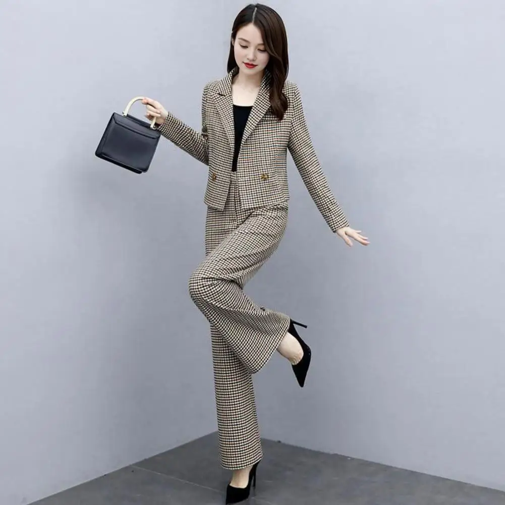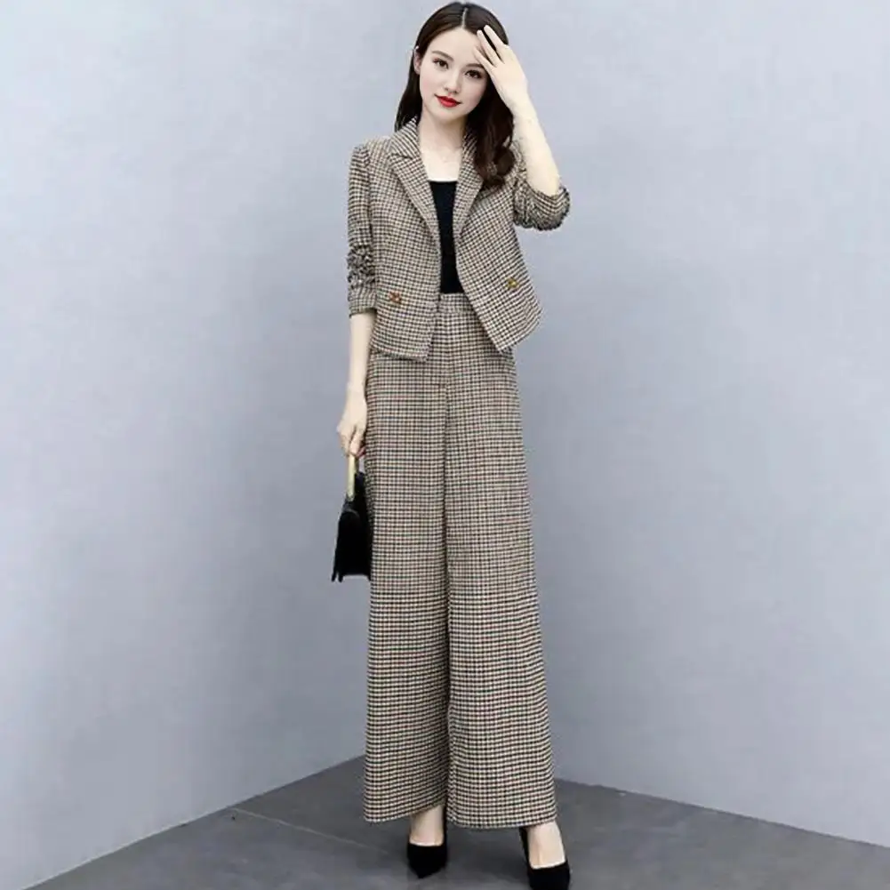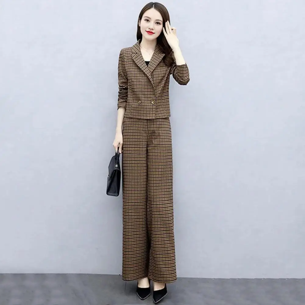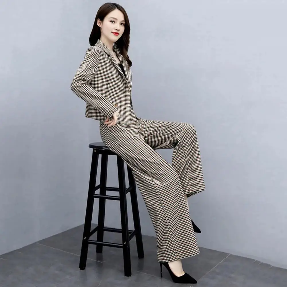 2 Pcs/Set Women Coat Pants Set Lapel Buttons Cardigan Plaid Print Long Sleeve Jacket Wide Leg High Waist Straight Trousers Lady Formal Commute Outfit