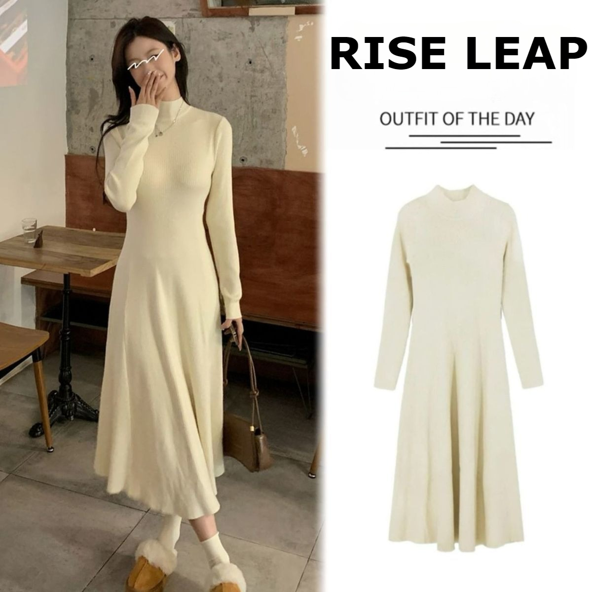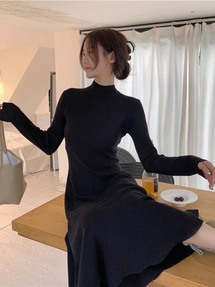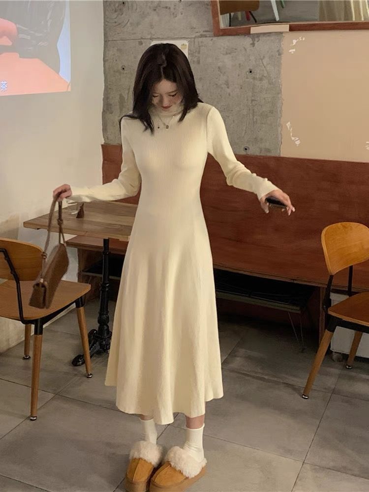 Embrace the chill with this cozy French style dress, featuring a semi-turtleneck and ribbed knit for added warmth.